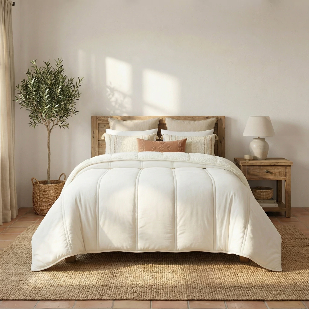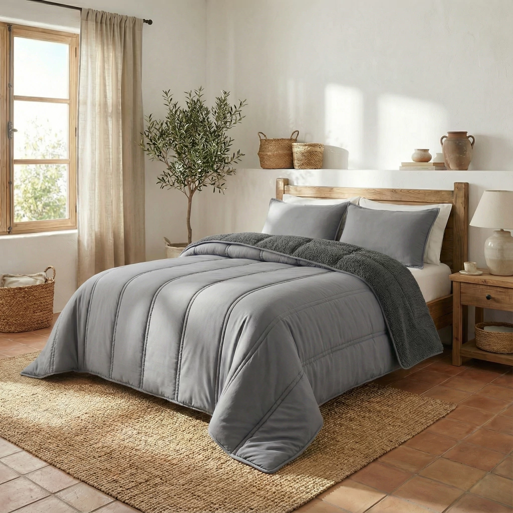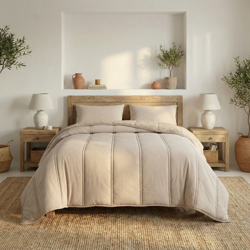 El Acolchado Nuage con Corderito está pensado para transformar tu habitación en un verdadero refugio de calidez y estilo. Su interior de corderito Sherpa, increíblemente suave al tacto, te envuelve con una sensación de abrigo ideal para las noches frías. Por fuera, su superficie de microfibra con delicada textura de rayas le aporta un toque moderno y sofisticado a tu dormitorio.