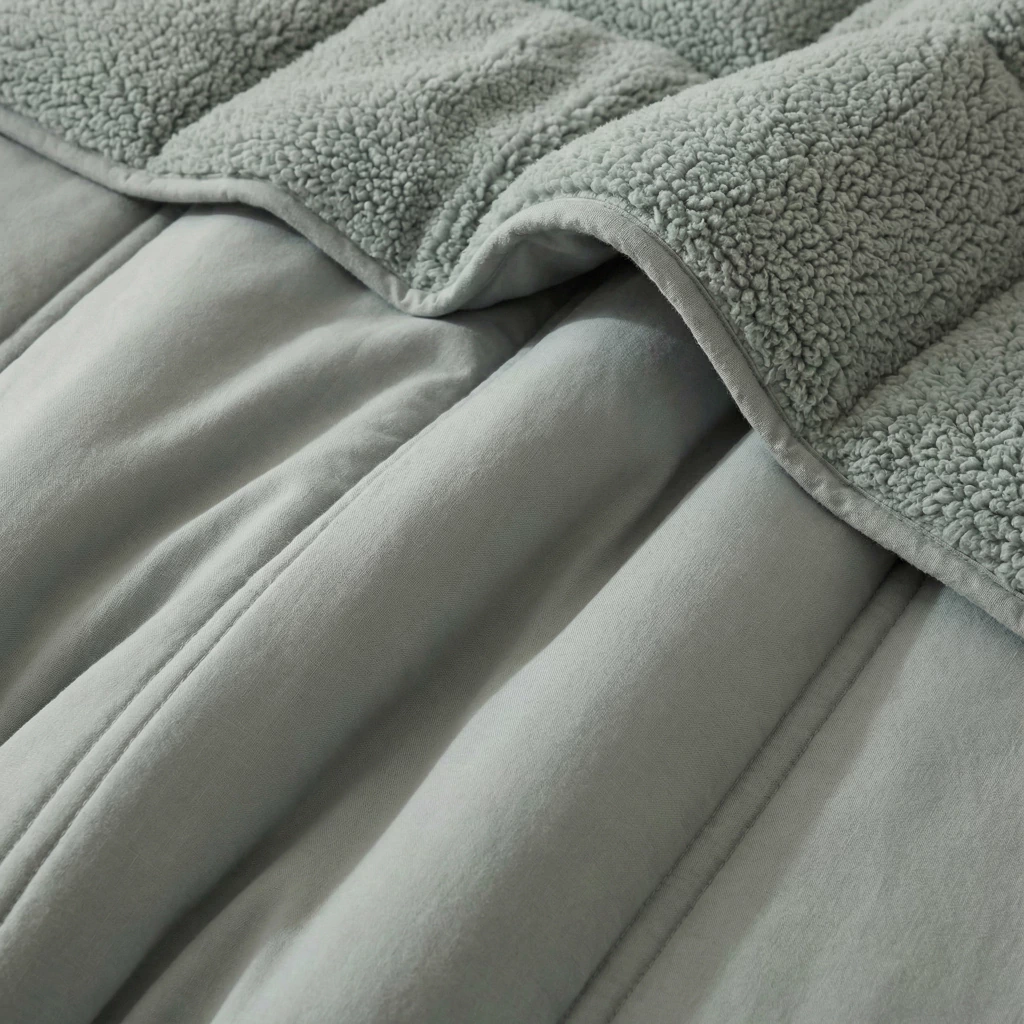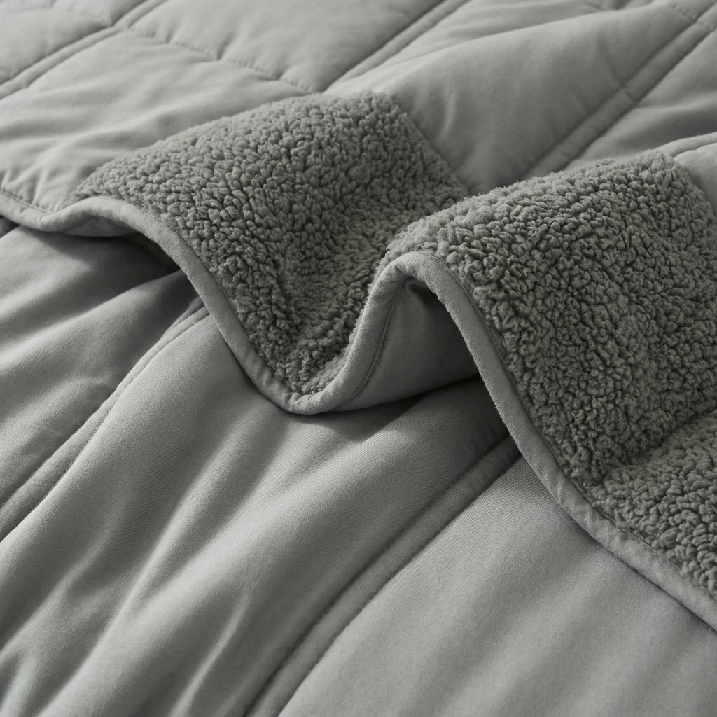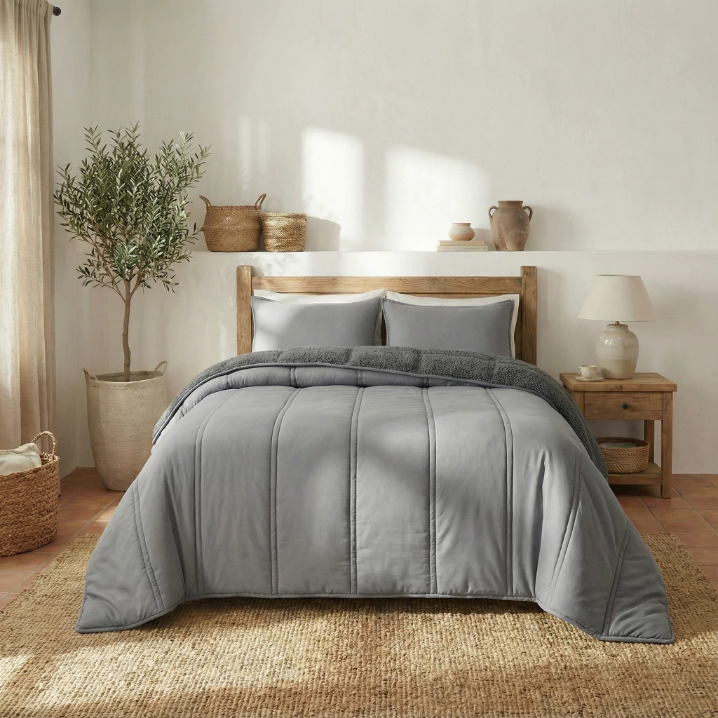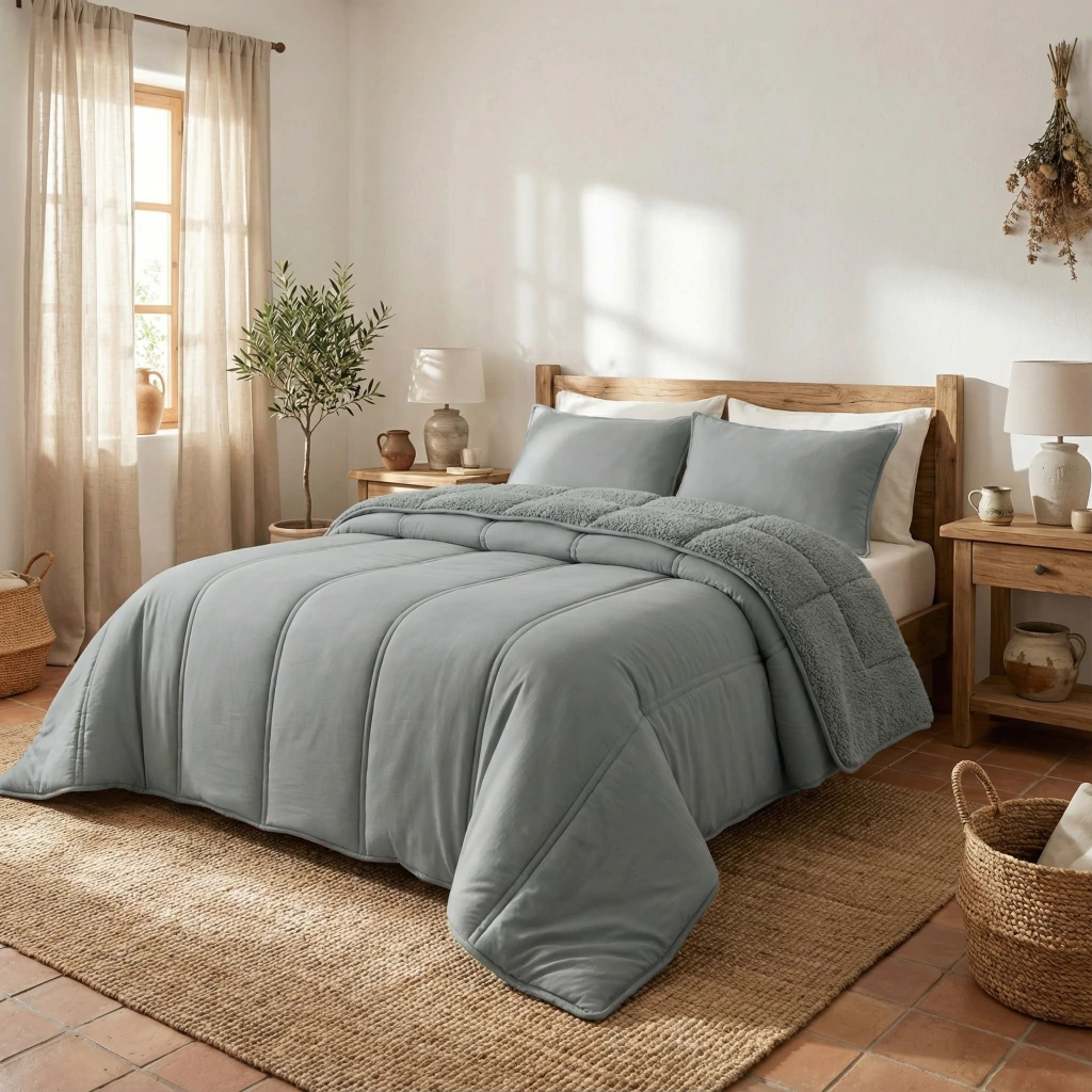 El Acolchado Nuage con Corderito está pensado para transformar tu habitación en un verdadero refugio de calidez y estilo. Su interior de corderito Sherpa, increíblemente suave al tacto, te envuelve con una sensación de abrigo ideal para las noches frías. Por fuera, su superficie de microfibra con delicada textura de rayas le aporta un toque moderno y sofisticado a tu dormitorio.