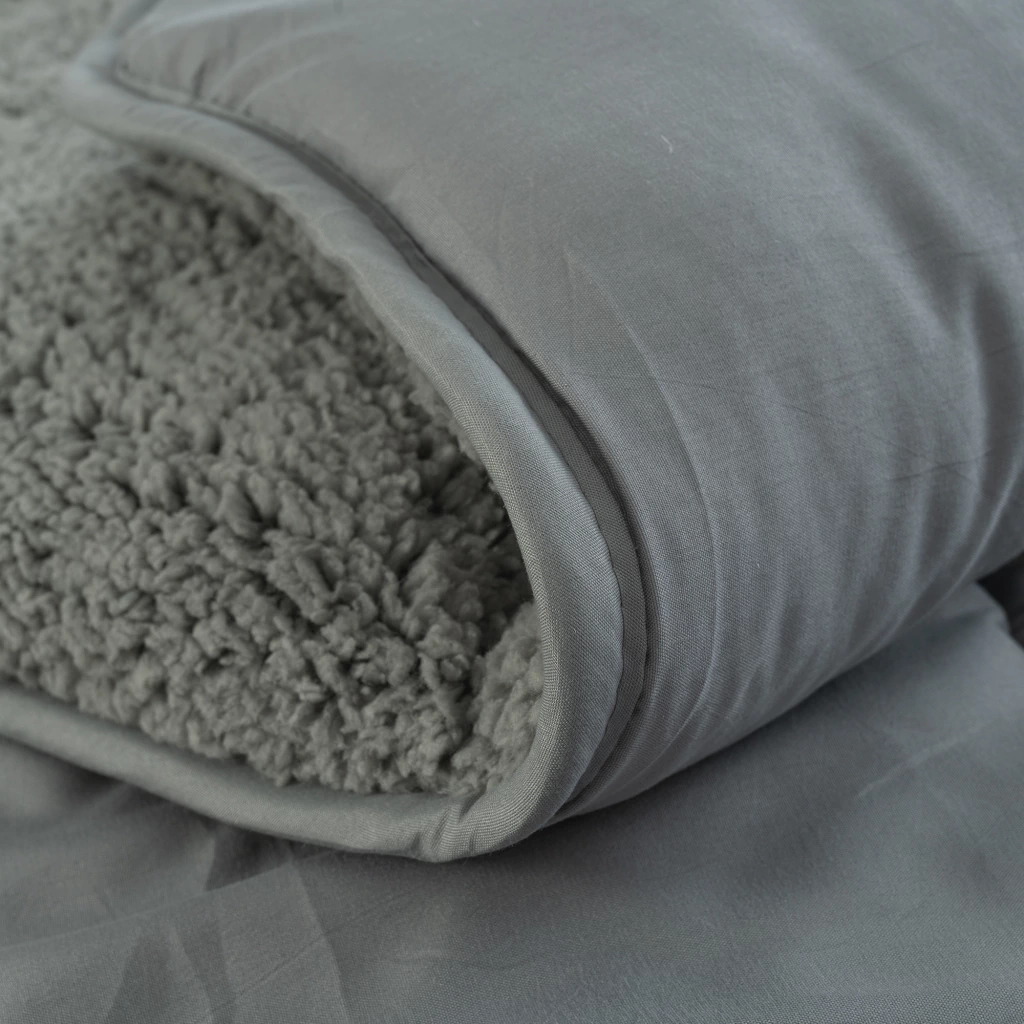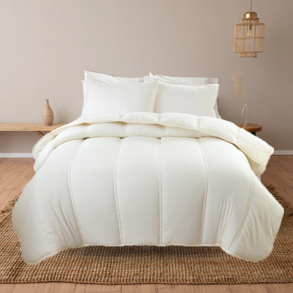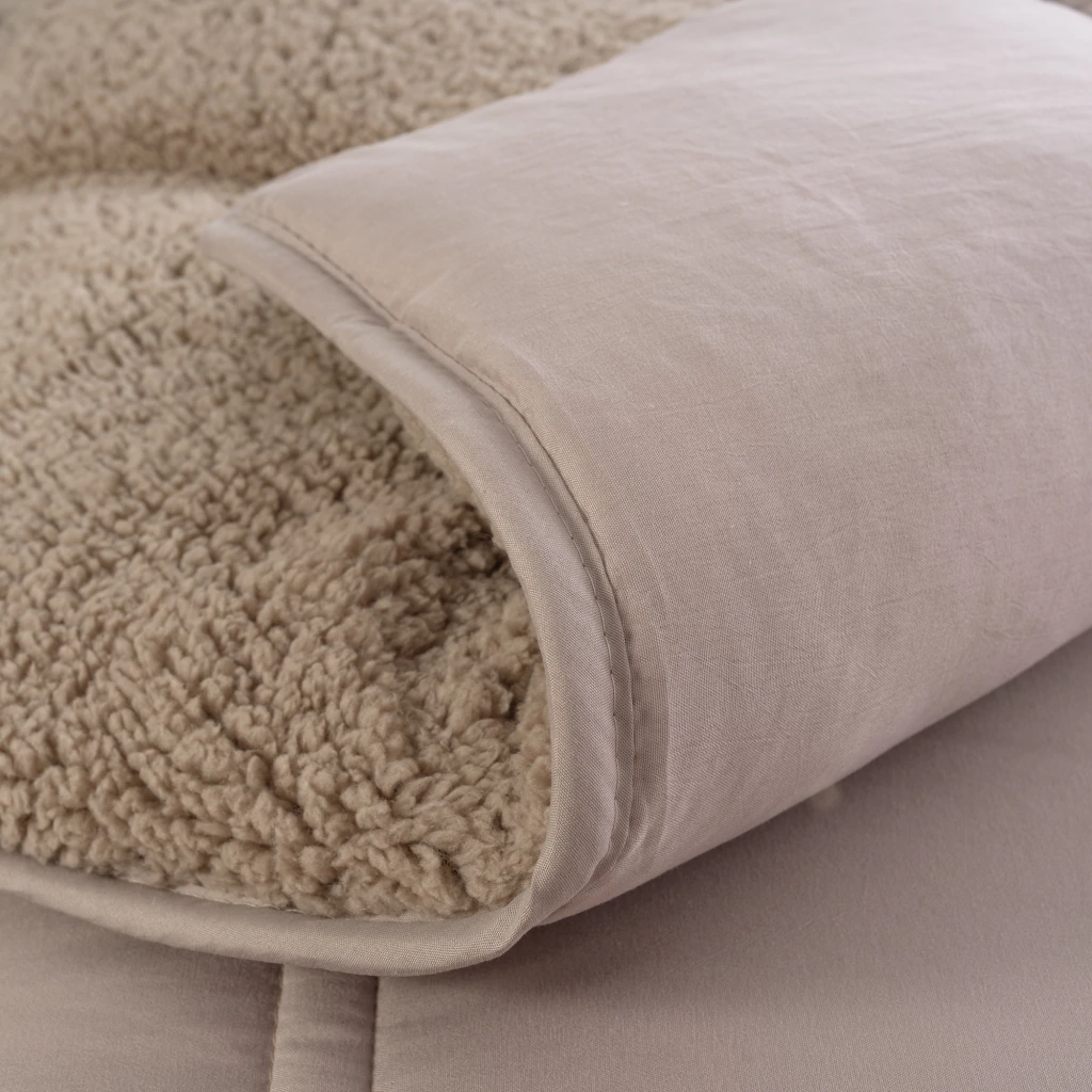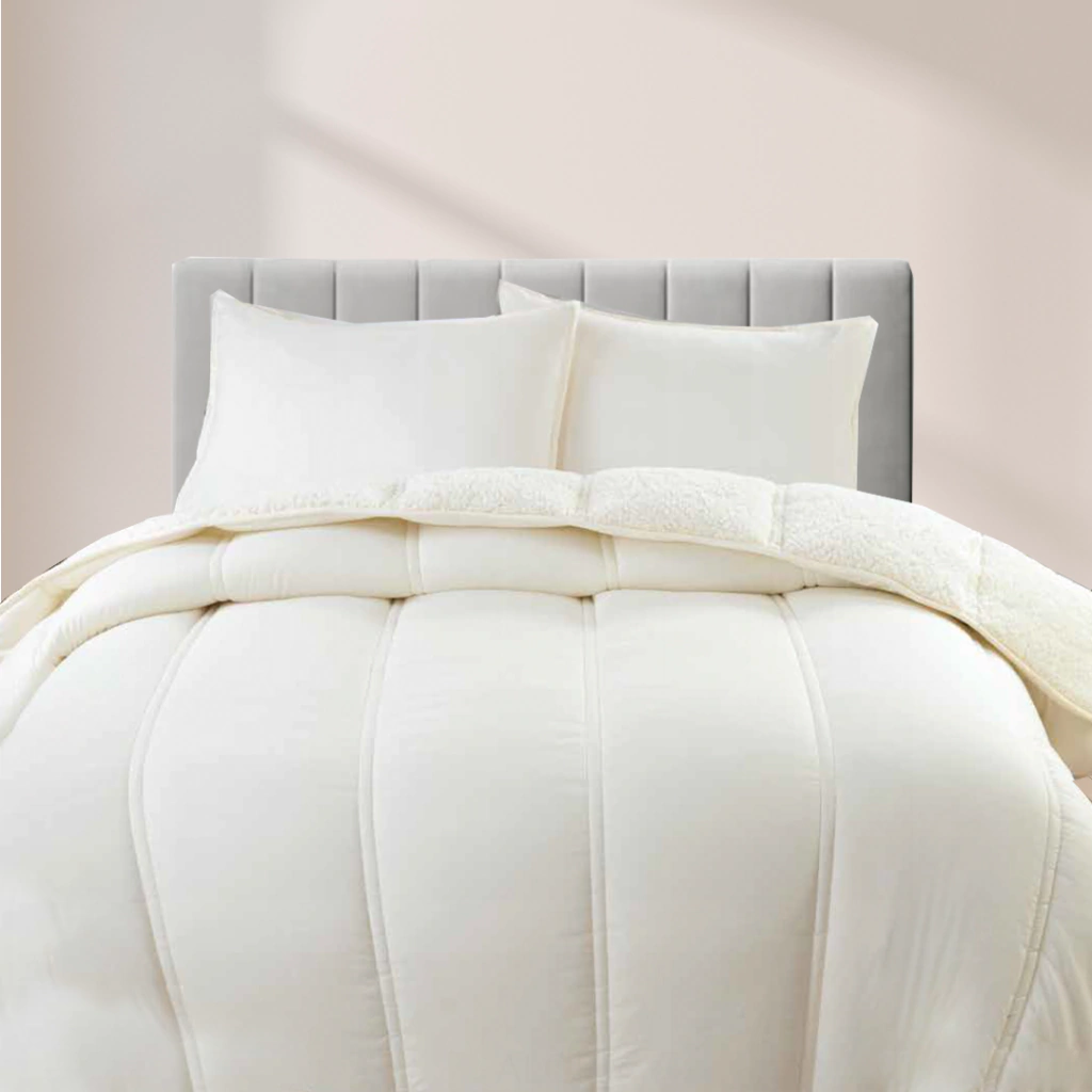 El Acolchado Nuage con Corderito está pensado para transformar tu habitación en un verdadero refugio de calidez y estilo. Su interior de corderito Sherpa, increíblemente suave al tacto, te envuelve con una sensación de abrigo ideal para las noches frías. Por fuera, su superficie de microfibra con delicada textura de rayas le aporta un toque moderno y sofisticado a tu dormitorio.