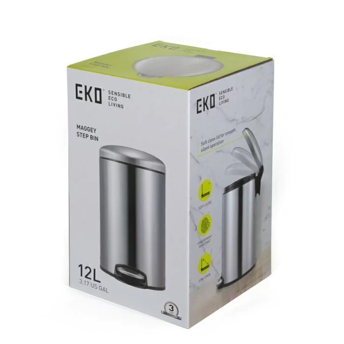EKO es una marca de prestigio en el sector de los productos para el hogar. Este cesto está fabricado en acero inoxidable pulido resistente a las huellas dactilares, con un acabado en 2 presentaciones blanco y negro brillantes que le dan un aspecto sofisticado y moderno. Su tapa de cierre suave y permanencia abierta, te permite depositar basura sin molestia ni malos olores, y su mecanismo de pedal accionado por palanca te ofrece una apertura cómoda y segura. Además, tiene un estabilizador de bolsa de plástico que mantiene la bolsa en su sitio y facilita el cambio.