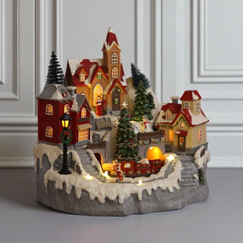 Viví la magia de la Navidad con nuestro Pueblo Navideño Decorativo con Iluminación LED, una escena encantadora que transforma cualquier espacio en un refugio festivo lleno de luz, tradición y calidez invernal.