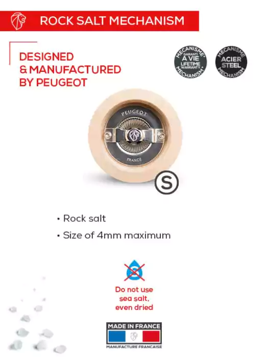 El molino París es uno de los modelos más emblemáticos de la marca Peugeot. Fácilmente reconocible por sus curvas y ondulaciones, es el molino arquetípico. Su carrocería de madera, certificada PEFC™, está torneada y pintada en la fábrica de Peugeot situada en el Este de Francia. La colección de París incluye muchos modelos. Disponible en muchas opciones para una gama de colores, tamaños y funciones. Aquí, el molinillo de pimienta Paris se presenta en un soberbio color chocolate. Su tamaño de 18 cm siempre causará impacto. A pesar de este tamaño, siempre es fácil de manejar y usar. El depósito de gran capacidad permitirá que el molino se utilice durante mucho tiempo antes de que sea necesario volver a llenarlo. El molinillo de pimienta Paris con acabado de chocolate está equipado con un mecanismo de molienda de acero, que viene con una garantía de por vida. Un signo innegable de calidad superior. Finalmente, usando su magnífica perilla dorada, puede ajustar la aspereza de su pimienta como desee.