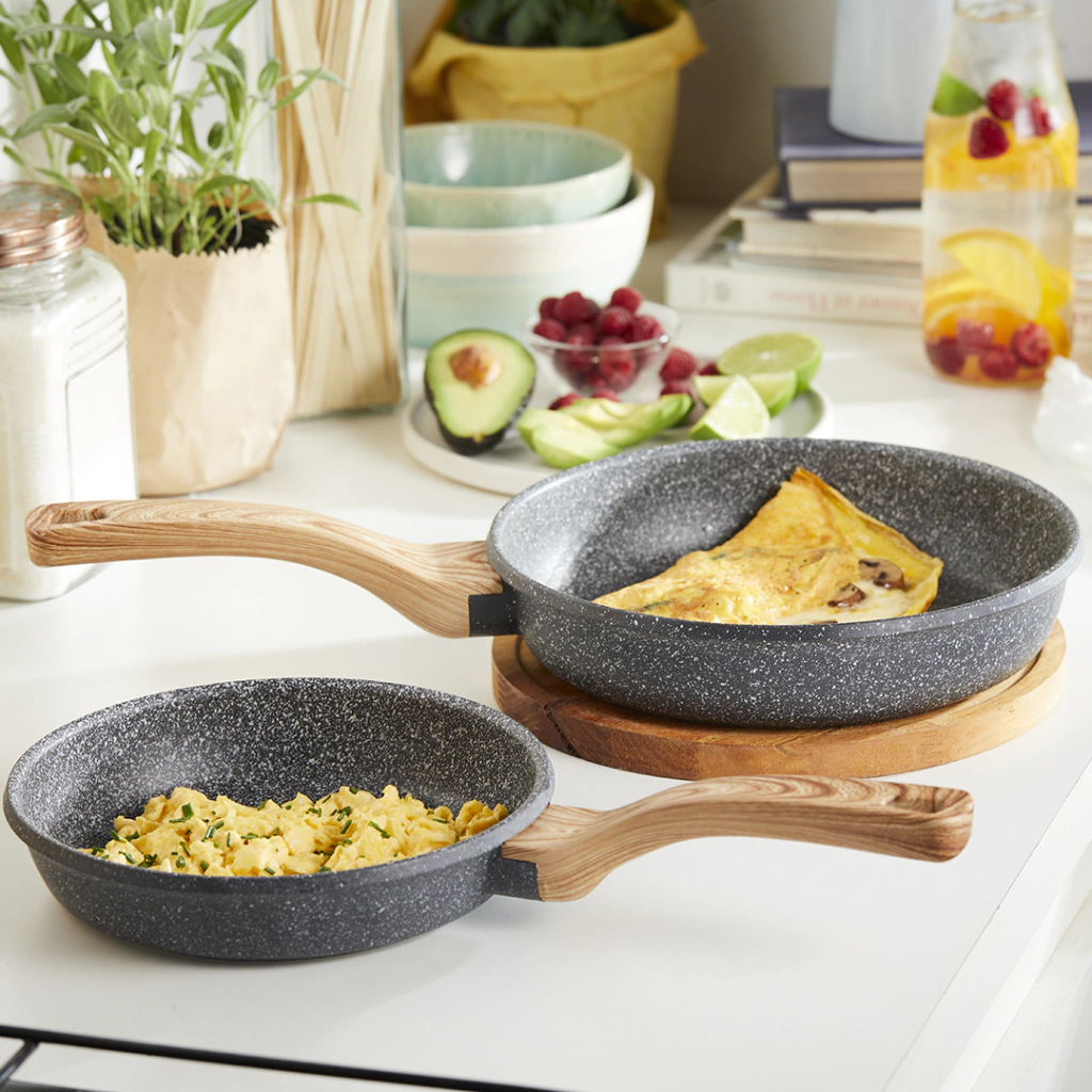 Sartén de 20 y 24 cm de diámetro aluminio forjado recubierto con antiadherente de alta performance comercialmente conocido como granite coating. Los mangos de madera siliconada permiten tener un diseño innovador evitando que se calienten.