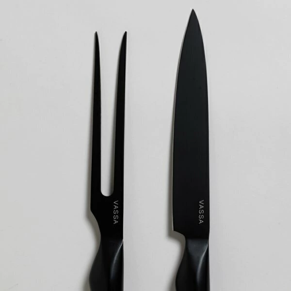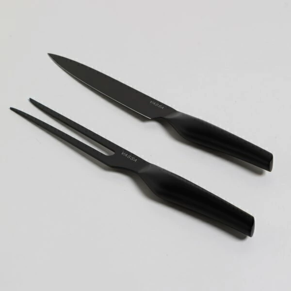 Diseñado para realzar cada momento alrededor del fuego, este set de asado VASSA combina estilo contemporáneo y alto rendimiento. Incluye cuchillo y tenedor fabricados en acero inoxidable con acabado negro, pensados para brindar precisión, firmeza y elegancia a la hora de cortar y servir. Su diseño robusto y sofisticado lo convierte en un aliado esencial para cualquier amante del asado.