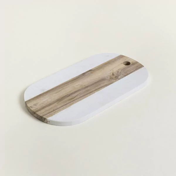 Tabla ovalada realizada en mármol combinada con madera de acacia natural. Ideal para servir y lucirse al mismo tiempo. El mármol aporta distinción y elegancia. De fácil limpieza y excelente calidad. Son perfectas para combinar con alguna línea de vinos.